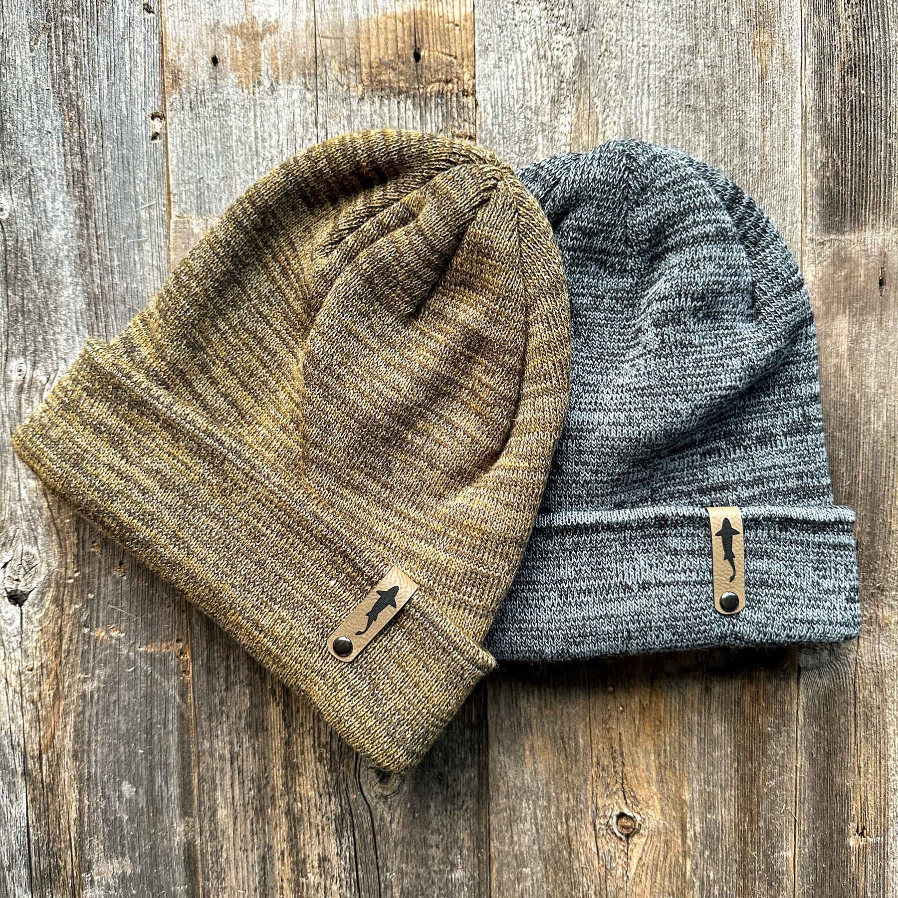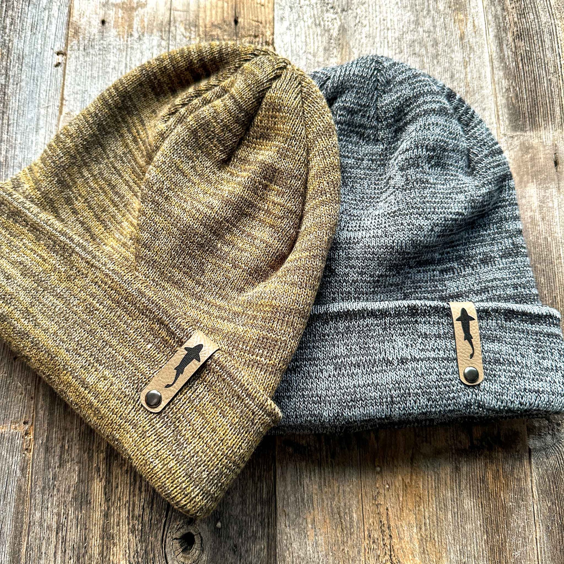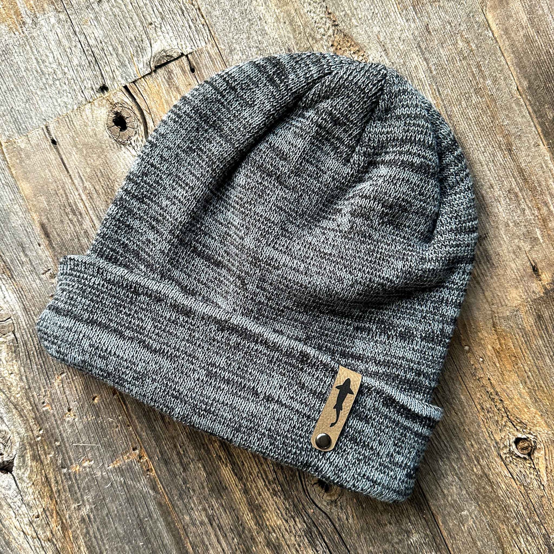 This super soft and warm beanie will keep your noggin' extra warm during your cold weather fishing other cold weather activities. The leather tag features a minimalistic trout swimming tag.