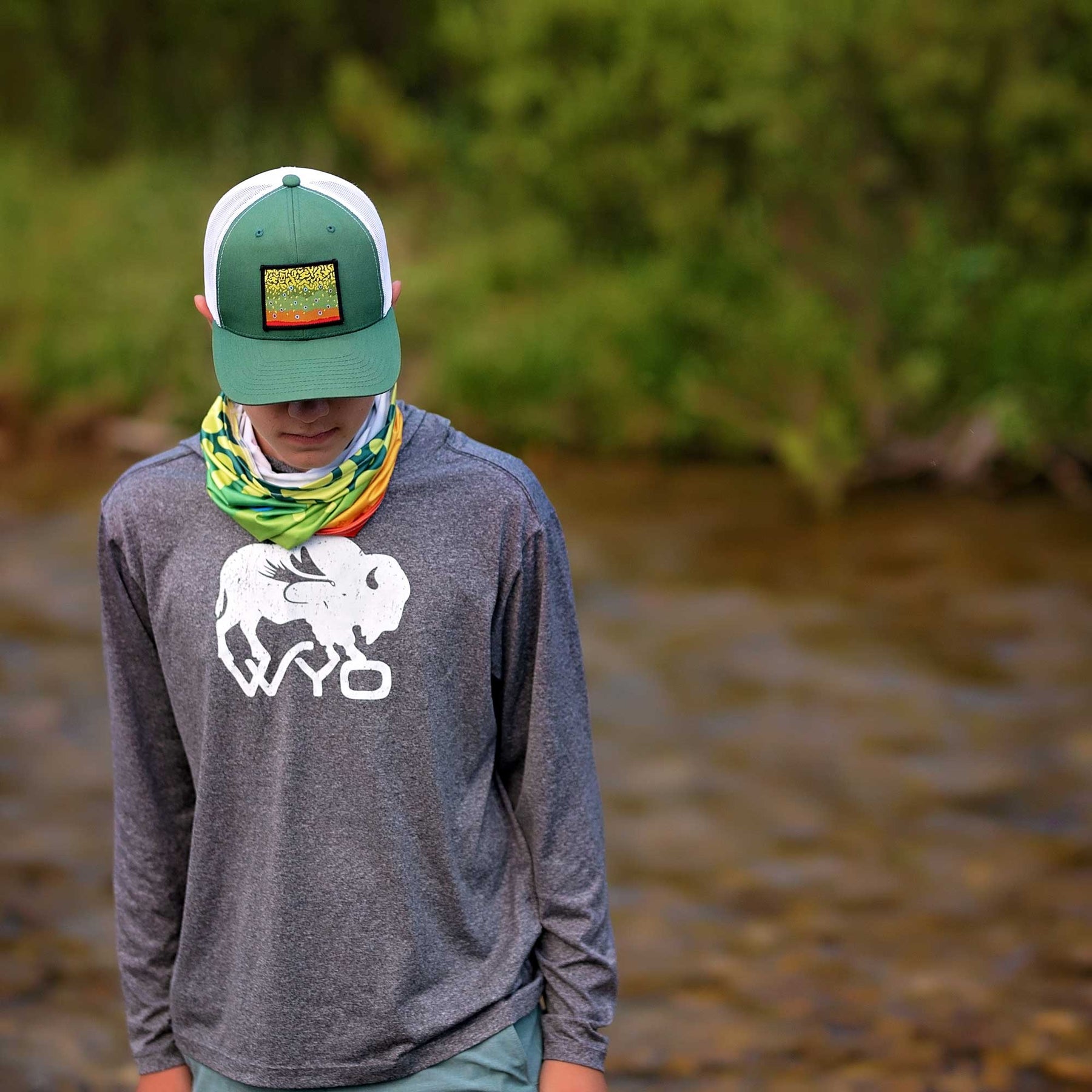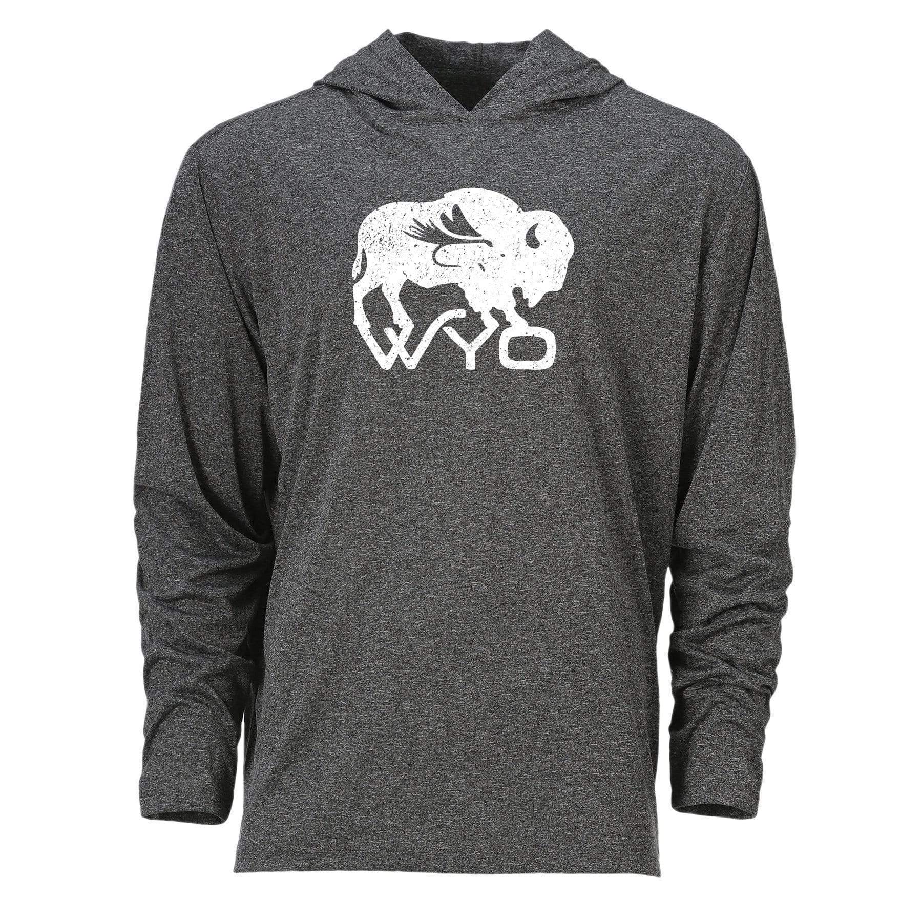 Hooded and Lightweight Wyo Fly Bison pullover featuring advanced moisture management fabric technology to wick away perspiration from the skin, 30UPF sun protection, stain, odor & snag resistant. Features thumbholes for added comfort and warmth.