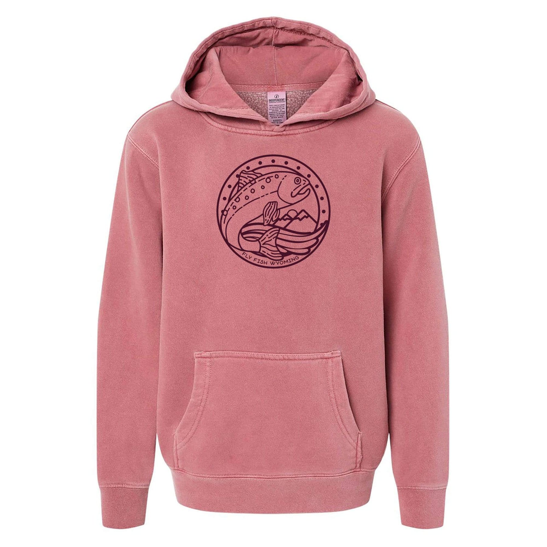 This youth midnight pigment-dyed hooded sweatshirt is a great weight for all kinds of activities, featuring our "Reel Fun" design on the front. Fabric has an on-trend vintage look and feel to it and this is featured in Pigment Maroon.