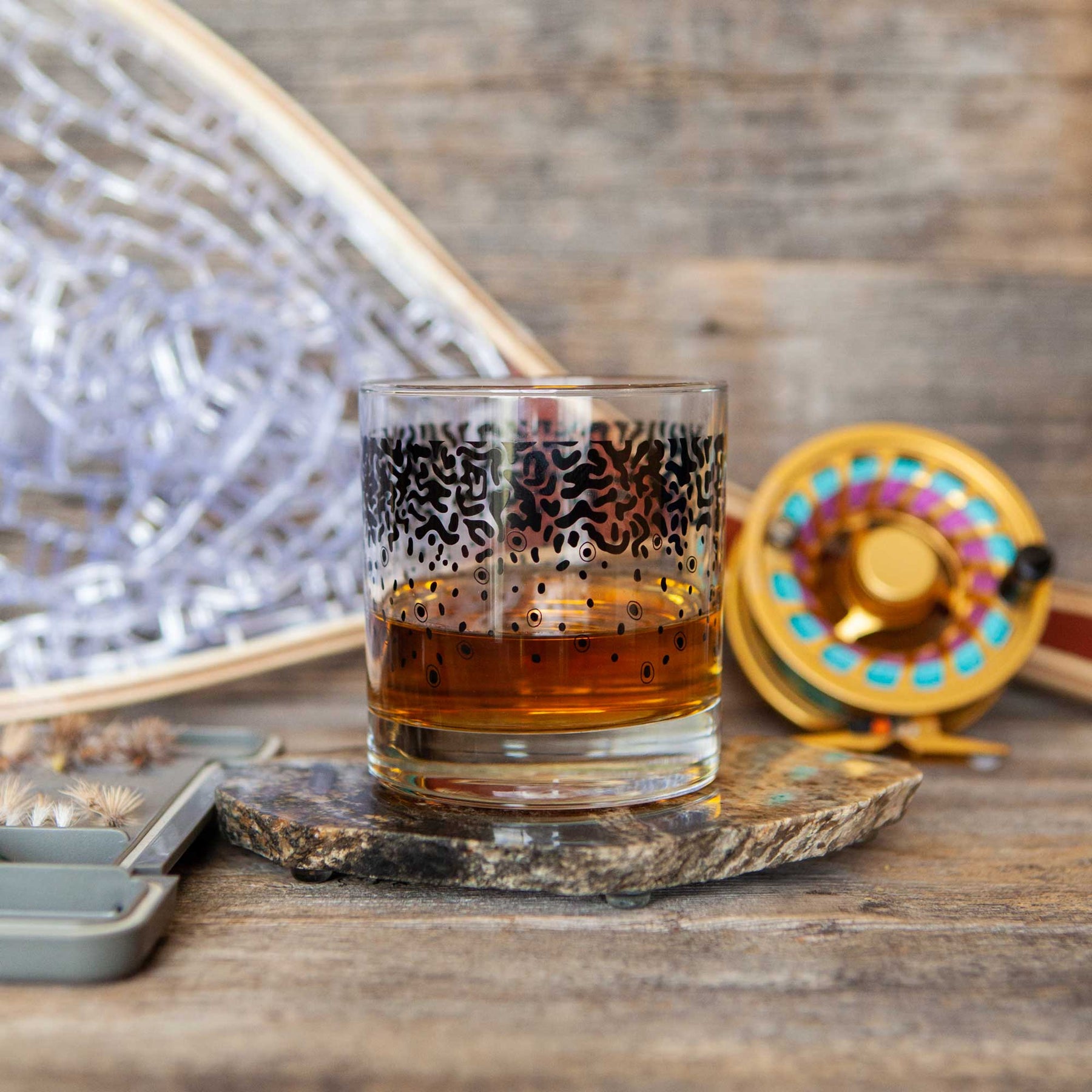 Grab yourself one of our sweet printed rocks glasses with a full wrap of your favorite trout pattern. Use it for whatever bevie you prefer, makes a great gift or statement piece in your bar or cupboards collection.