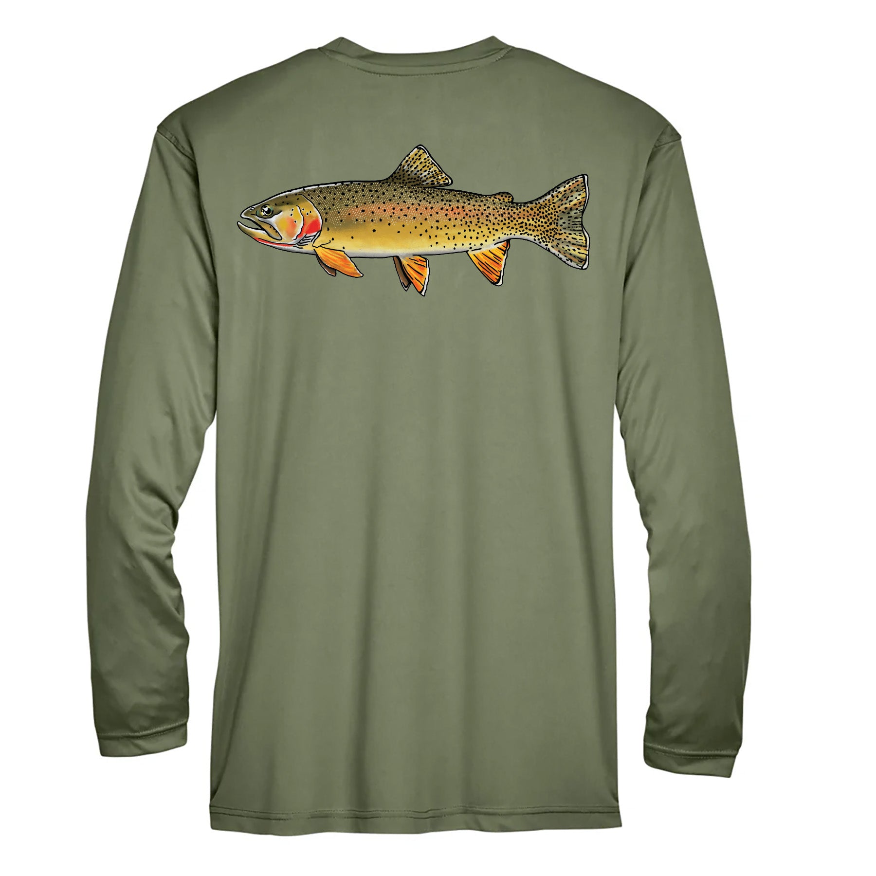 Hook into adventure with the Snake River Cutty Performance Long Sleeve, built for long days chasing trout beneath the Wyoming sun. Featuring a hand-drawn Snake River Cutthroat on the back and a matching Fly Fish Wyoming logo on the chest, this shirt is your badge of life on the water.