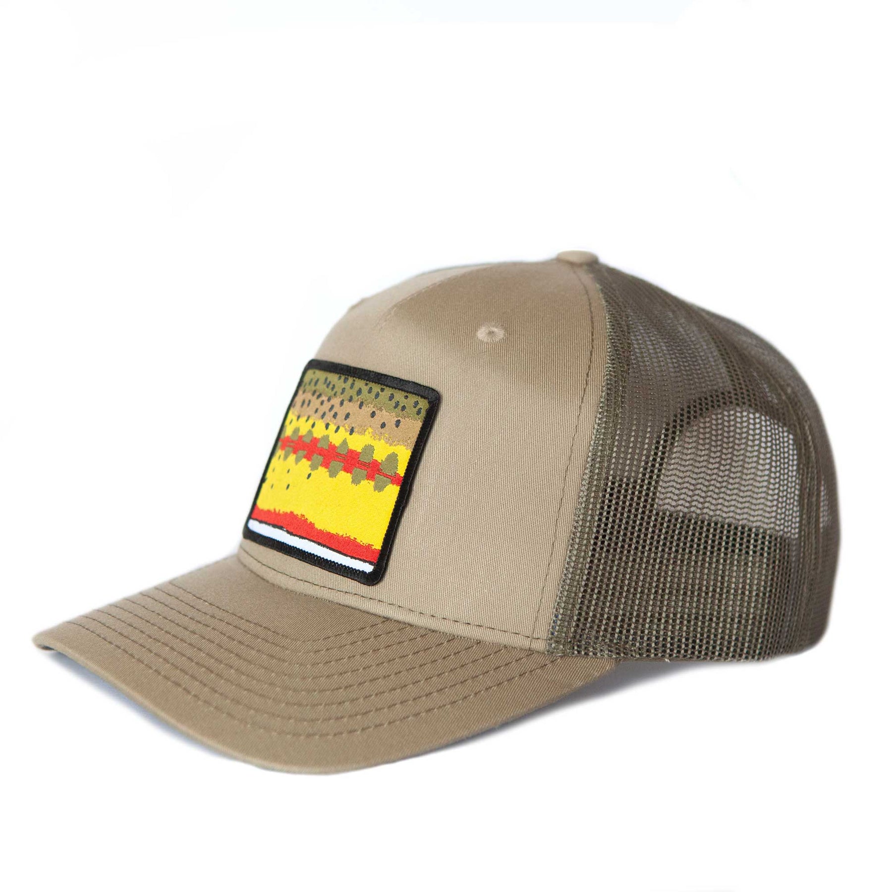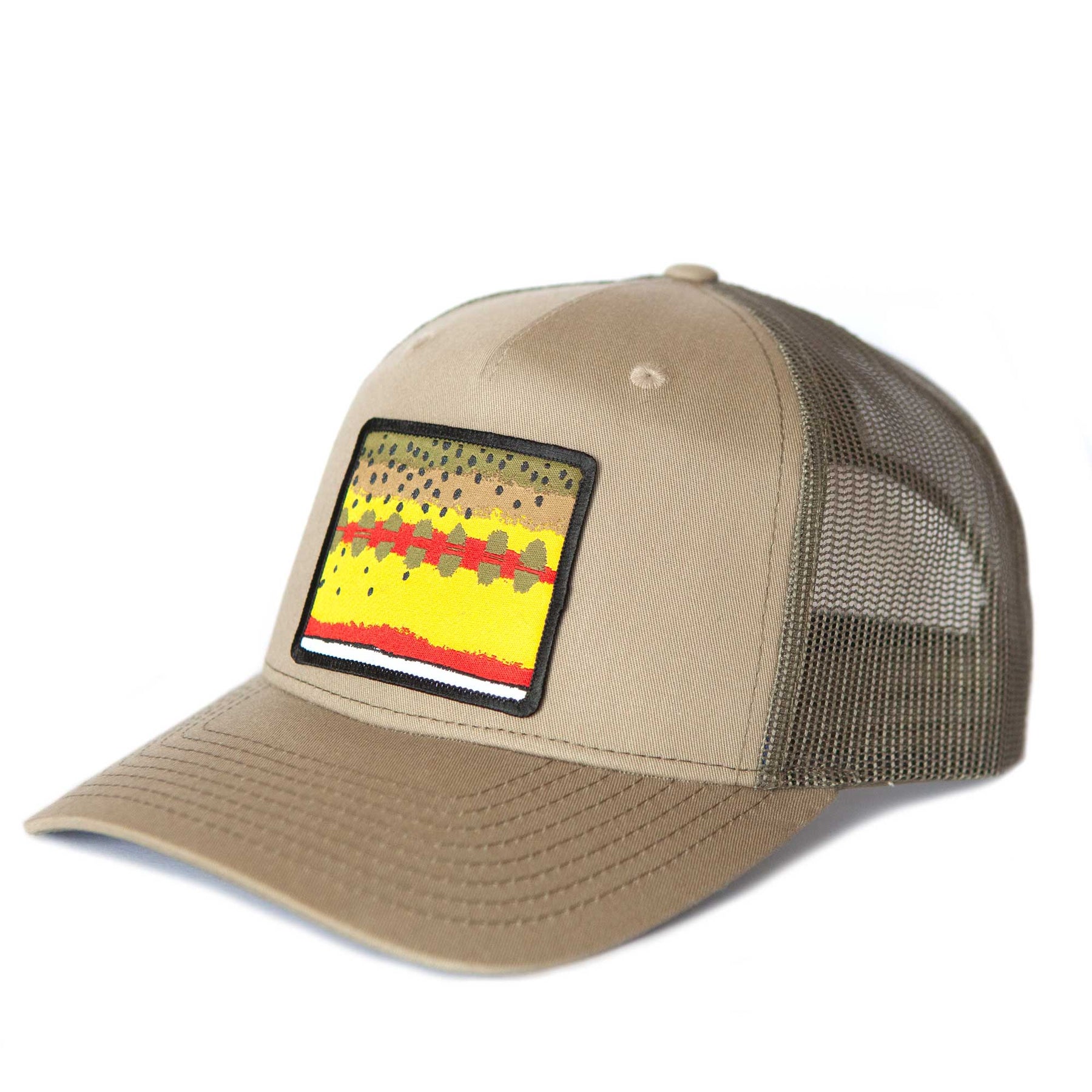 Rep your favorite trout pattern with this sweet Golden Trout pattern patch hat! The hand-drawn patch is in the shape of the State of Wyoming!