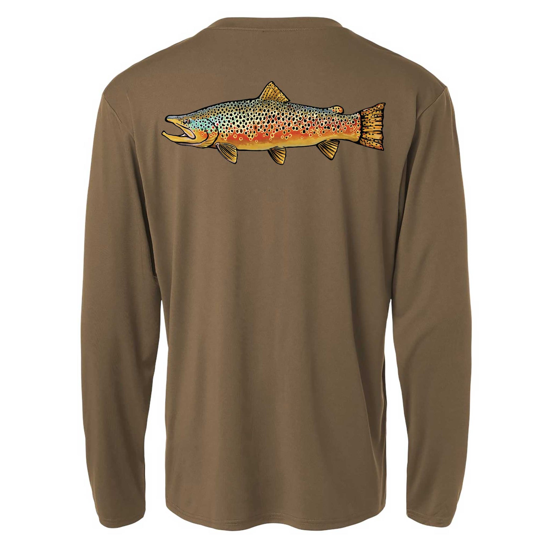 Hit the water in style with the Brown Town Performance Long Sleeve — a must-have for anglers who live for the chase. Featuring a hand-drawn Brown Trout on the back and the Fly Fish Wyoming logo on the front chest, this shirt celebrates one of Wyoming’s most iconic species.