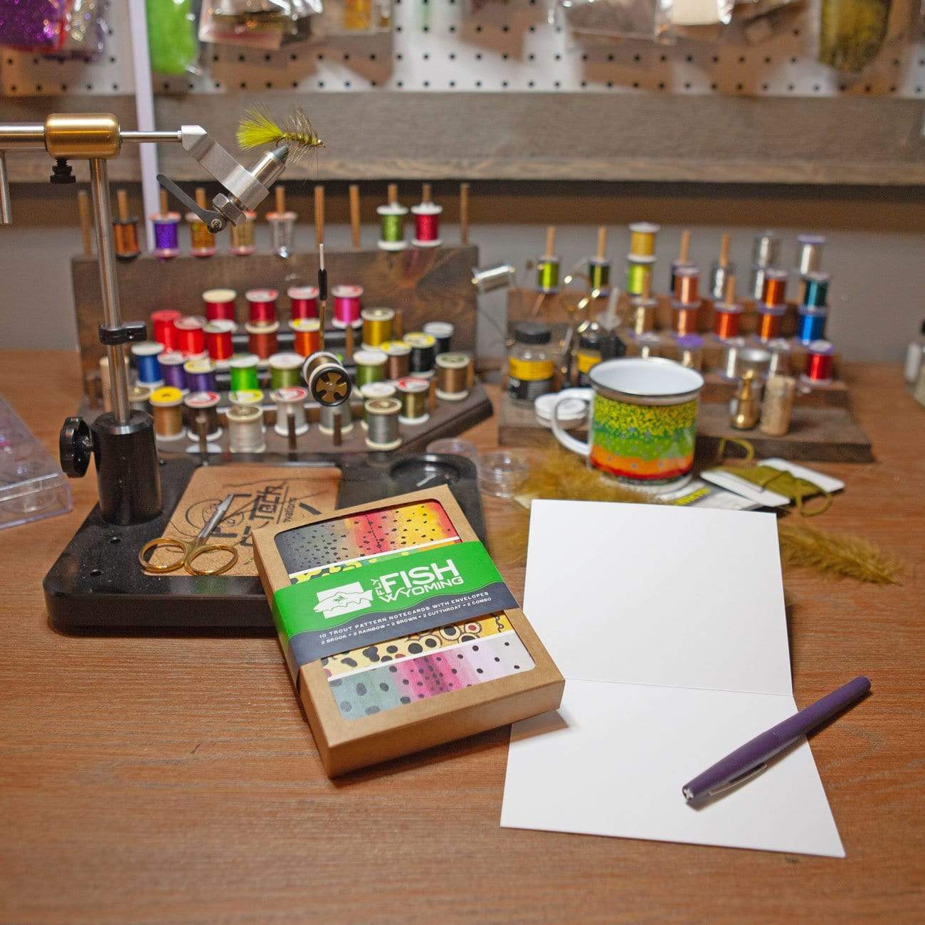 Up your correspondence game with these hand-illustrated trout pattern notecards! 10 in each package with 2 each of rainbow trout, brook trout, brown trout, cutthroat trout and a combo of all four patterns. Envelopes included. Notecards, envelopes and packaging is 100% recycled material.